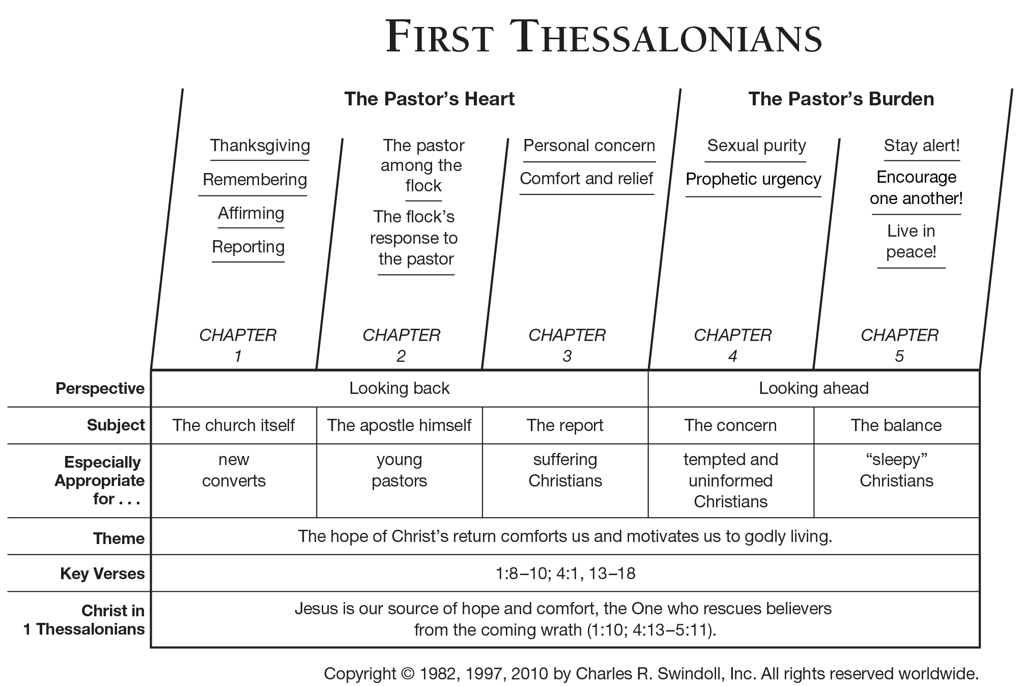 How can I apply it?: From Chuck Swindoll: Do you ever feel as though your Christian faith has grown stale, that you are withering on the vine when you would rather be flourishing in His service? Paul’s first letter to the Thessalonians is the perfect remedy for such a feeling. Its focus on Christ’s return provides water for the thirsty soul today, encouraging growth in maturity by providing hope in the midst of suffering or uncertainty.