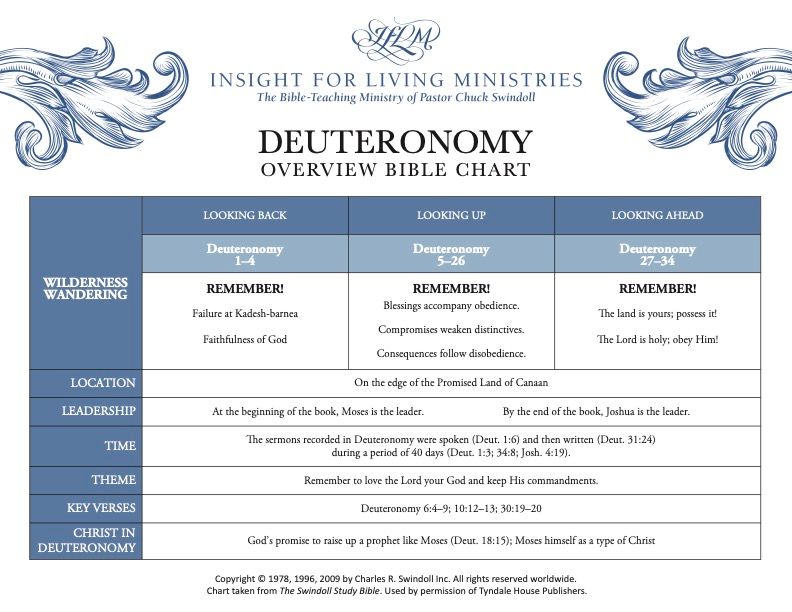 What is the big idea: The overall concept of this book is "second law." Moses is giving the new generation the law first given to their parents. During this time, there was no mass production of the covenant for everyone to read. Moses tells the nation to gather every 7 years to hear the words of the law that he is writing in this book. He wants to make sure everyone has the tools they need to love the Lord, honor the Lord, and obey the Lord.